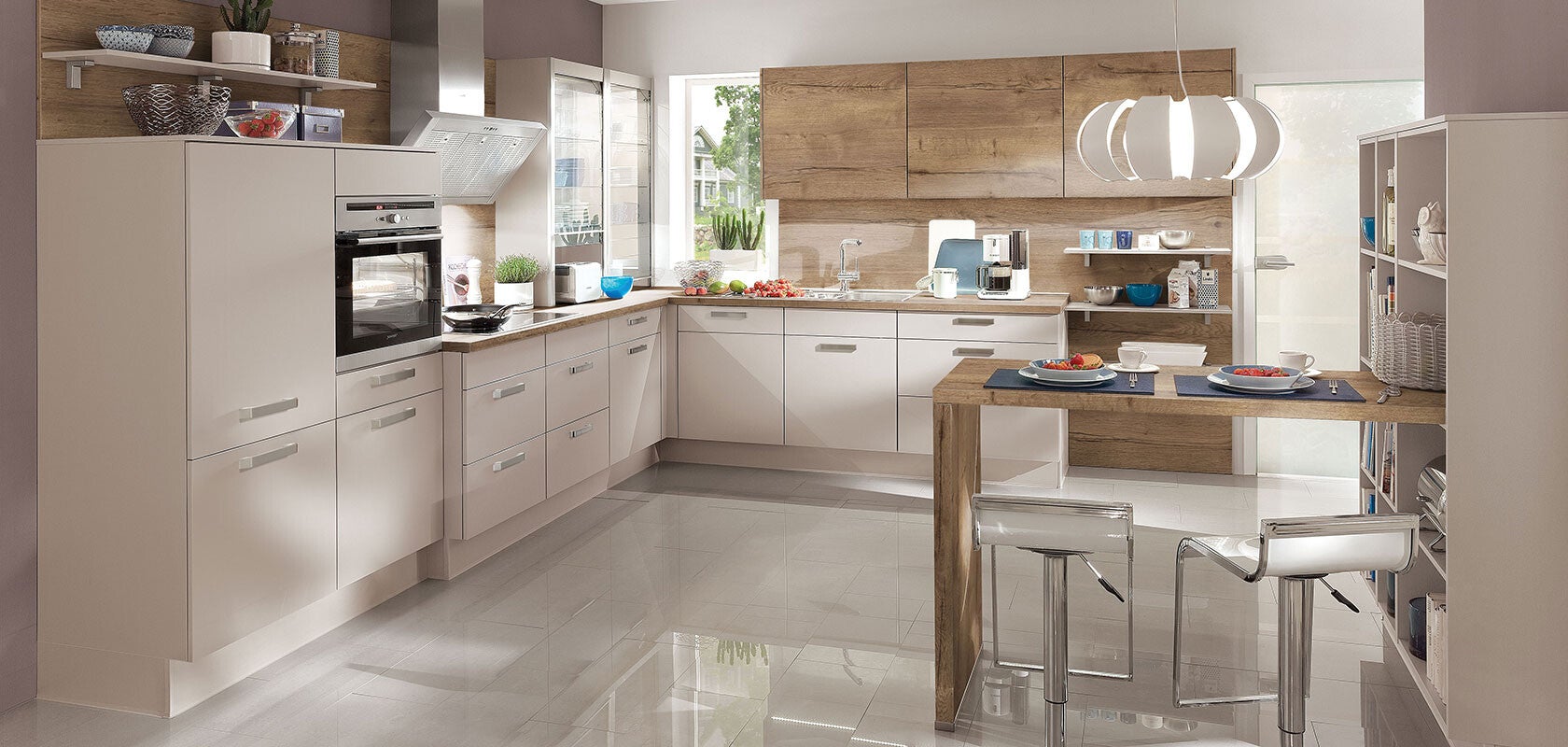 Les conceptions à hauteur de plafond permettent d’optimiser l’espace. Visuelles et fonctionnelles, elles organisent l’espace de rangement de manière personnalisée, efficace et esthétique, même dans les petites cuisines. Un bout de nature : avec sa belle structure le veinage de l’ilot de la cuisine, le plan de travail et la crédence en décor chêne maître créent un contraste agréable avec les façades de cuisine grise mate.