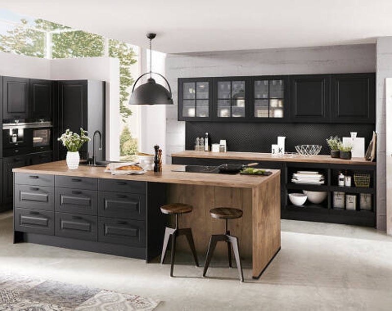 Une cuisine moderne de maison de campagne bien équipée : avec par exemple des poignées en fonte, des portes vitrées à croisillons rectilignes, un éclairage innovant et des éléments à poser de grande hauteur. Un nouvel habitat sans fioritures.